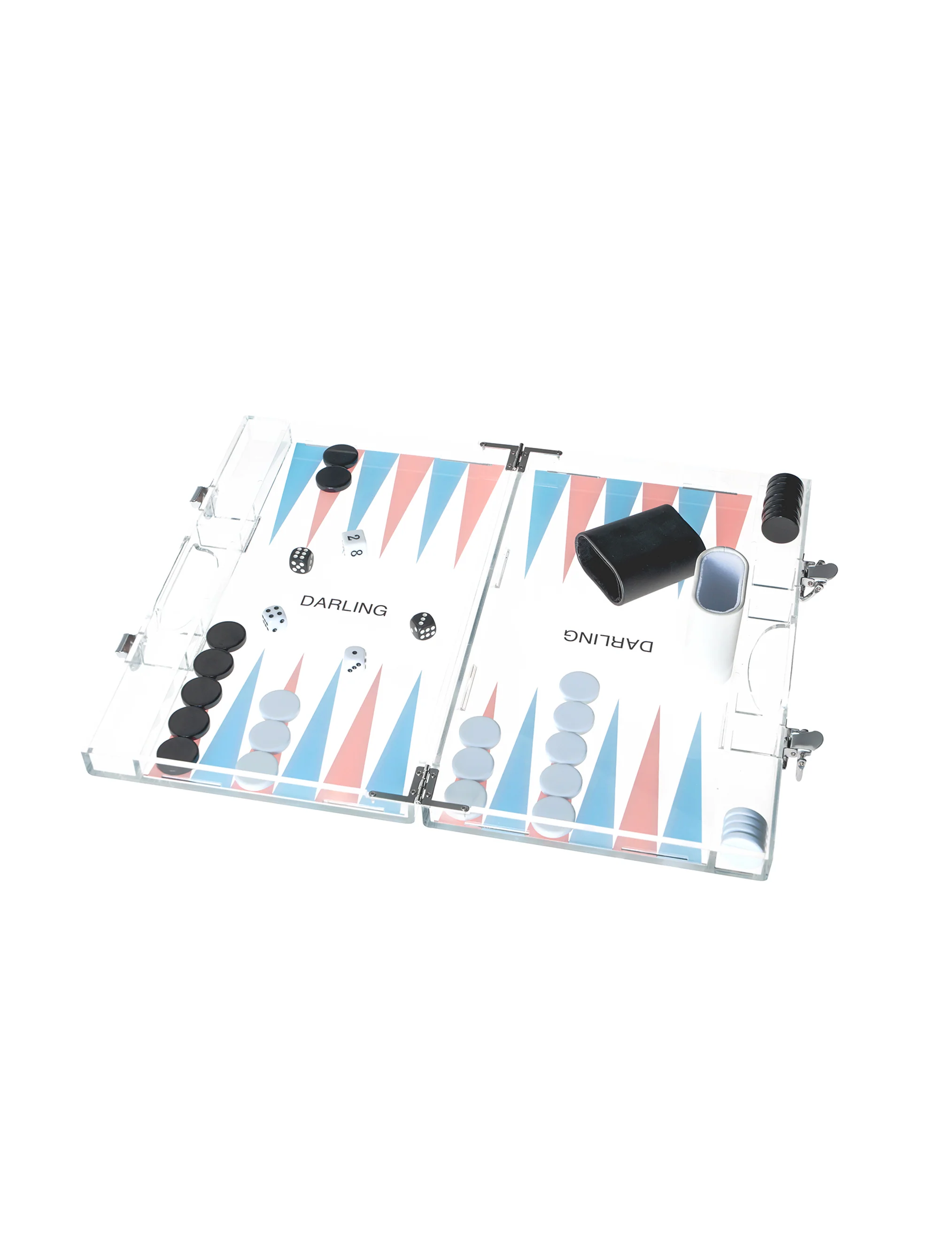 MODERN DESIGN: Contemporary backgammon set made of clear acrlyc with pink and blue triangle markers. Magnetic closure and sleak curves make our backgammon set the perfect piece to display and play!